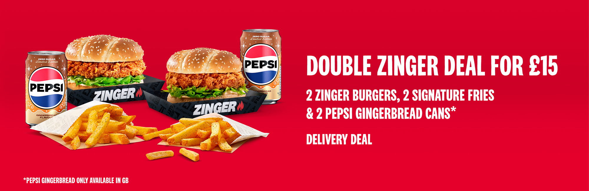DOUBLE ZINGER DEAL WITH 2 PEPSI GINGERBREAD CANS FOR £15, DELIVERED TO YOUR DOOR.