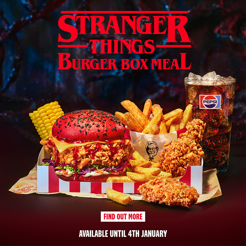 These products are available from 10th November 2025 until 4th January 2026 and while stocks last. Available at participating restaurants & delivery partners in the UK & ROI only. Delivery fees apply. Subject to availability. KFC reserves the right to withdraw the products at any time and without notice. • Participating restaurant trading hours apply. Stranger Things™/© Netflix. Used with permission. KFC name, design and related marks are the intellectual property of Kentucky Fried Chicken (Great Britain) Limited © 2025. All rights reserved.